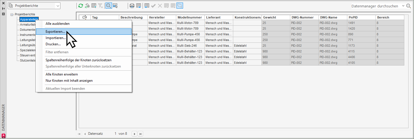Exportiere Daten per AutoCAD Plant3D Datenmanager in eine *.csv-Datei.