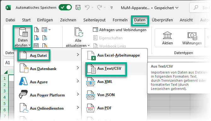 Erstelle eine „leere“ MS Excel Arbeitsmappe und importiere anschließend Daten aus der zuvor exportierten *.csv-Datei