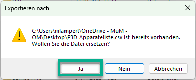 Beim Überschreiben der „Datenquelle“ *.csv sollte die MS Excel Arbeitsmappe geschlossen sein, um Schreibschutz-Konflikte zu umgehen.