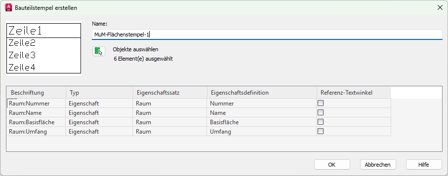 Um eine neue Bauteilbeschriftung – hier Flächenstempel - zu erstellen, kannst Du zunächst mehrere Texte hinzufügen und bei Bedarf Grafiken ergänzen (Rahmen). Diese Textzeilen sind „Platzhalter“.