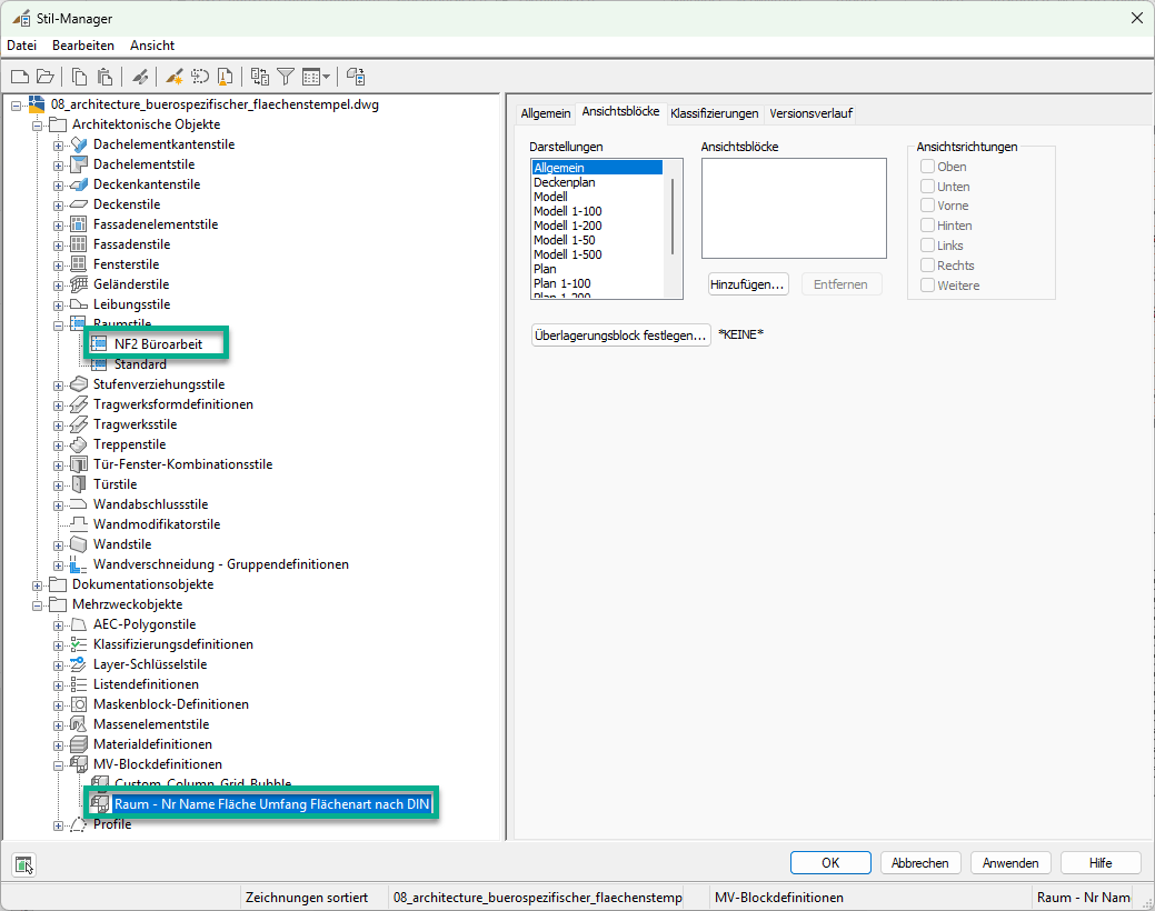 Von Anwenderseite erreicht uns häufig die Frage nach bürospezifischen Flächenstempel und deren Verwaltung. Um einen solchen zu erstellen, sollest du mit Bauteil-Stilen und MV-Blockdefinitionen vertraut zu sein. Räume werden über einen Raumstil, deren Beschriftungen über eine MV-Blockdefinitionen definiert. Du kannst beides im Stil-Manager Verwalten – Stil und Darstellung – Stilmanager finden und bearbeiten.