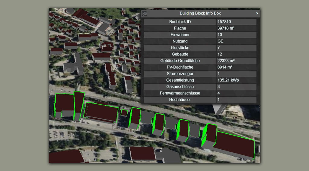 Erste Informationen kamen aus dem Gebäude-Kataster und der Datenbank der „genehmigten Gebäude“ von der Stadtverwaltung. Die Anzahl der Stockwerke liess sich aus dem 3D-Modell ermitteln; das Baujahr lieferten die Baugenehmigungen und Gutachterausschüsse. Auch Angaben zu Gebäudenutzung, Wärmepumpen, Solarenergieflächen und vieles mehr kamen aus dem GIS des Rathauses. Die Stadtwerke, die Klimaschutz- und Energieagentur Baden-Württemberg und die Landesanstalt für Umwelt BW lieferten ebenfalls Daten. „Der Suchaufwand war erheblich“, erzählt Thomas Bellon, Abteilungsleiter Geoinformation. „Nicht alle Daten, z. B. über Rohrleitungen und Hausanschlüsse, standen flächendeckend zur Verfügung.“