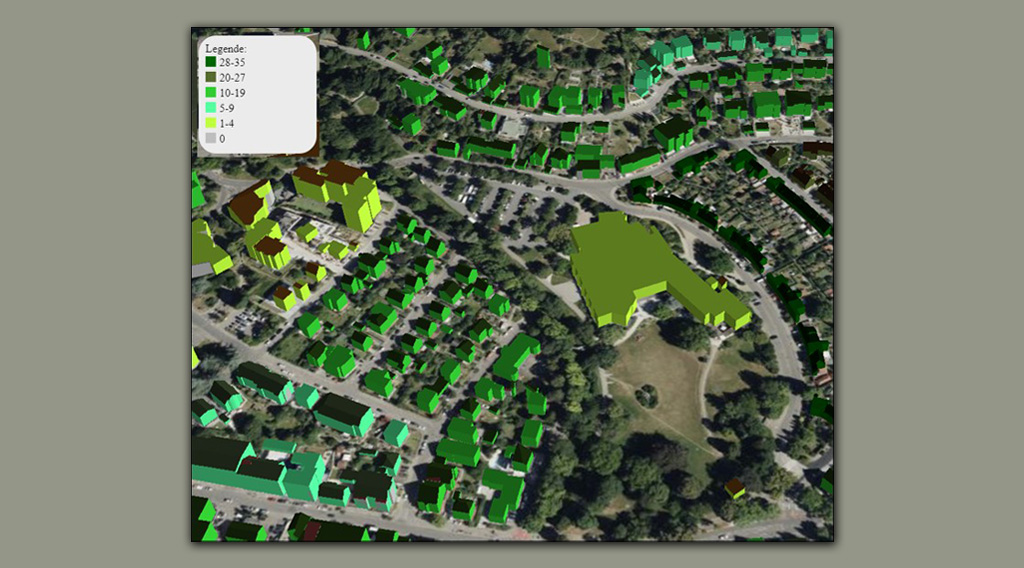 „Die Daten für die Wärmeplanung über SQL-Schnittstellen zusammenzuführen, war eher eine einfache Aufgabe“, sagt Geomatiker Fabian Finkbeiner. „Am schwierigsten war, Strassennamen zu vereinheitlichen; es ist ja nicht immer einfach festzustellen, ob ‚Hans-Martin-Schleyer-Strasse‘ und ‚Hanns-Martin-Schleyer-Strasse‘ wirklich dieselbe Strasse bezeichnen.“ Im Rahmen der Masterarbeit wurden die gesammelten Daten dreidimensional visualisiert. Diese Daten werden früher oder später in das bestehende 3D-Modell der Stadt integriert werden.