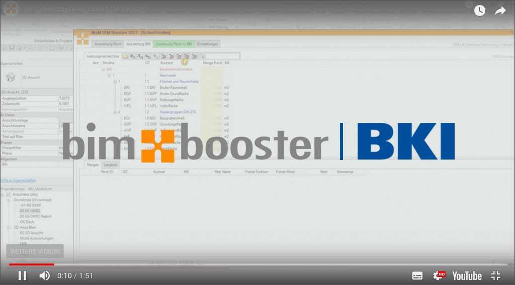 Die kostenlose BKI-Schnittstelle im BIM Booster von Mensch und Maschine ermöglicht Revit-Anwendern, direkt BGF (Bruttogrundfläche), BRI (Bruttorauminhalt), NUF (Nutzungsfläche) sowie die Elemente-Mengen, wie z. B. Wand- und Deckenflächen, aus dem CAD-Modell in den BKI Kostenplaner zu transferieren. Der BKI-Kostenplaner, mit über 1.000.000 statistischen Kostenkennwerten zu über 130 Gebäudearten und über 3.500 abgerechneten Baukosten-Referenz-Objekten, nutzt diese geometrischen Kennwerte für die Kostenplanung nach DIN 276 und Leistungsbereichen.