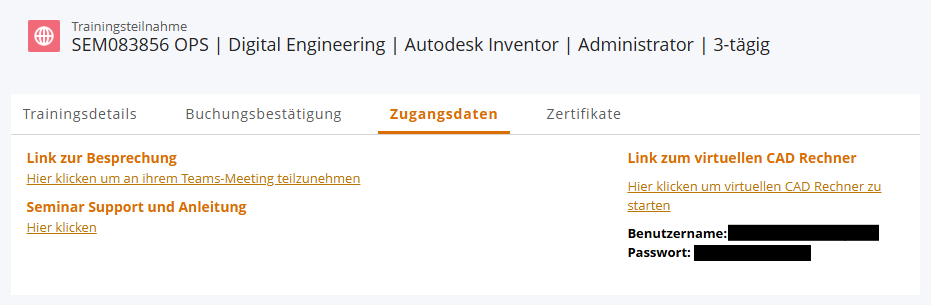 Um zu Ihrem virtuellen Rechner zu gelangen, klicken Sie unter "Zugangsdaten" bitte auf "Link zum virtuellen CAD-Rechner".